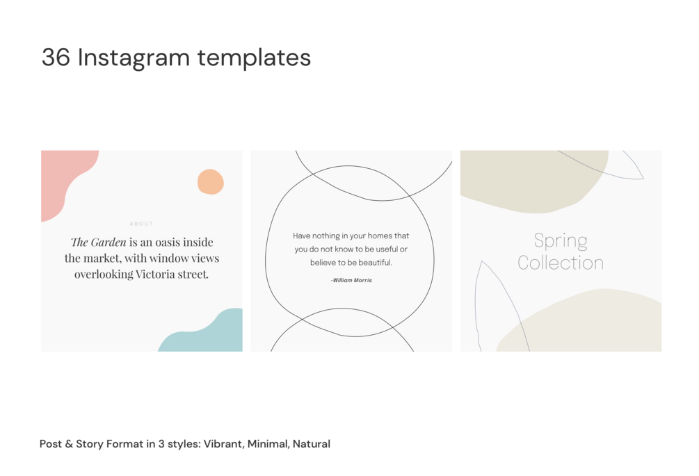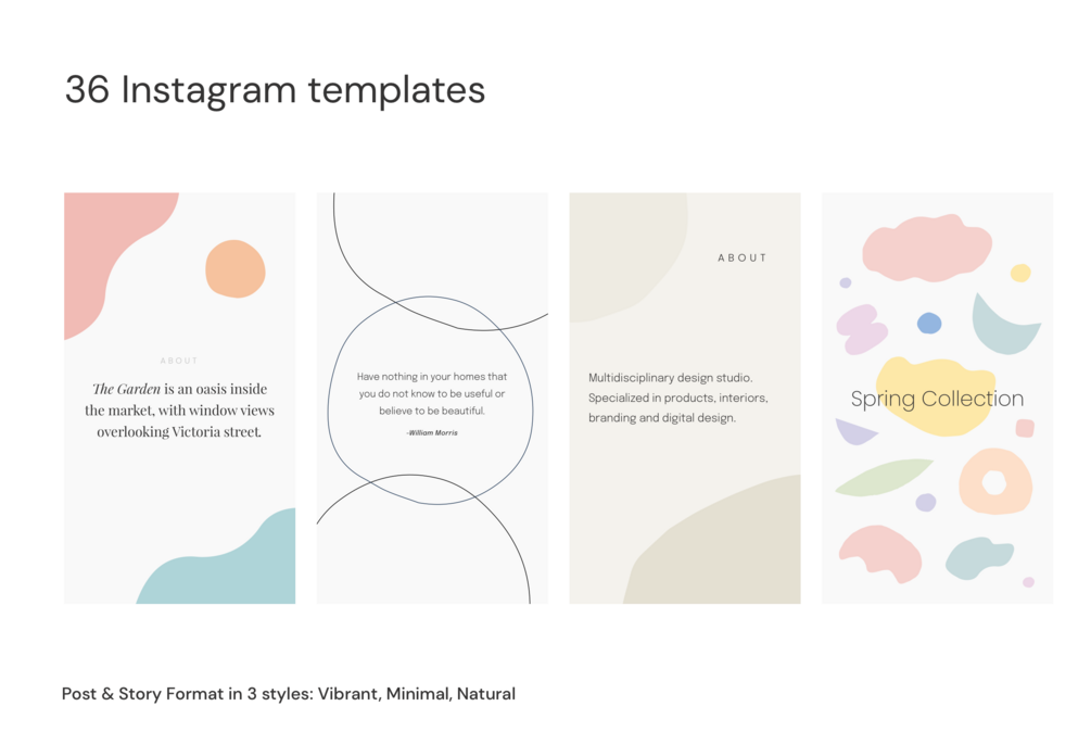 In addition to vector shapes, this collection includes 36 ready-made Instagram templates for posts and stories. You can simply edit the templates or use them as inspiration when creating your own.