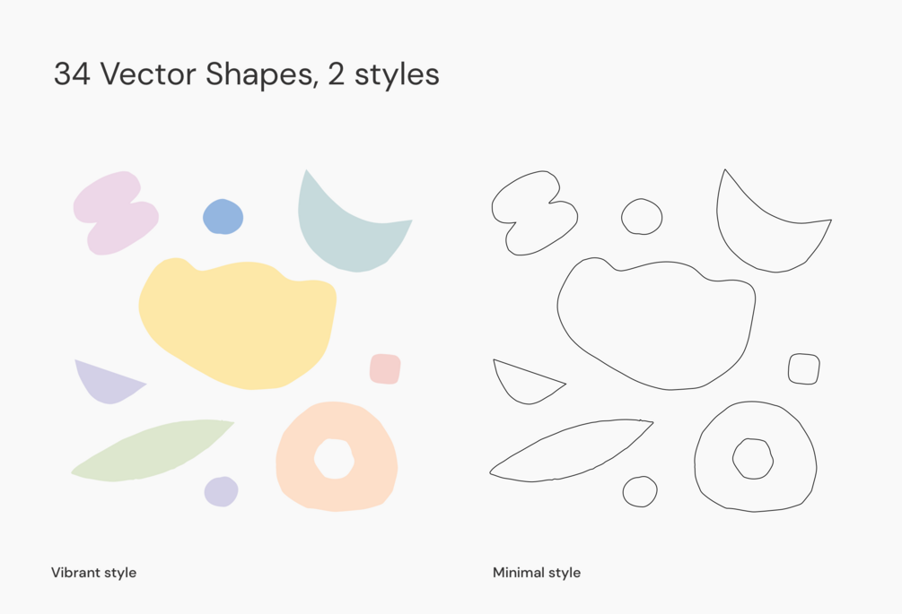 This modern collection includes 34 hand-drawn vector shapes in two styles: vibrant and minimal. Use this collection to create colorful patterns, backgrounds, art prints, stationery, branding, Instagram posts, invitations, and more.