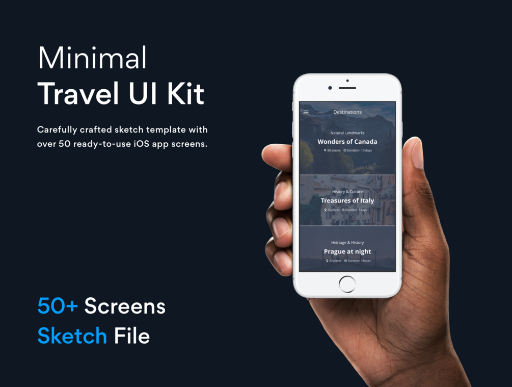 Carefully crafted Minimal Travel UI Kit (Sketch Template). This UI Kit features more than 50 ready-to-use screens for your new projects. The kit aims to speed up your design process and help you achieve a more professional and pixel-perfect look.
